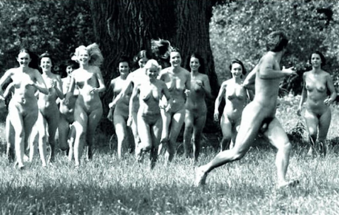 Голые девки бегут за голым парнем